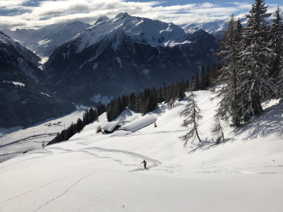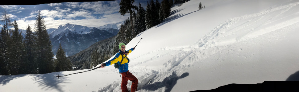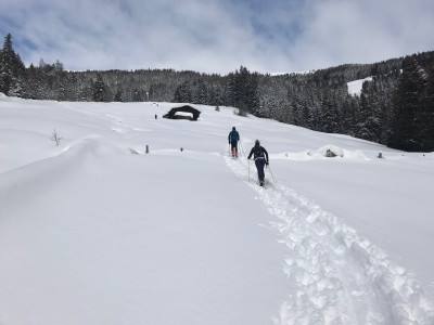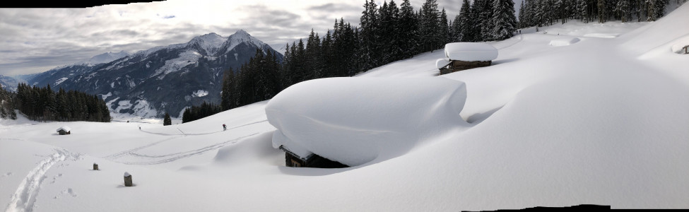 In unserem diesjährigen Winterurlaub dachte Meik schon vorher daran, endlich mal eine Skitour zu unternehmen. Freunde die parallel mit in Bramberg weilten, sind bereits erfahrene Skitourengeher und so viel die Entscheidung nicht wirklich schwer. Die Ausrüstung am Vortag war schnell bestellt und so konnte es am Tag darauf entspannt gegen 9 Uhr losgehen. Muss man auf den ersten Metern noch der Talabfahrt folgen, biegt der Weg bald idyllisch und sehr ruhig in den Wald ab.