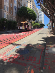 In San Francisco hatten wir uns vorgenommen einen richtigen hausgemachten Burger mit Pommes zu essen. So verschlug es uns nach kurzer Recherche in ein kleines unscheinbares Lokal namens „Pearl Deluxe Burger“. Der Laden glich eher einem Imbiss und hatte nur wenige Sitzplätze, von denen wir glücklicherweise einen ergatterten. Der Burger war frisch zubereitet und hausgemacht. Gut gesättigt machten wir uns auf den Rückweg und suchten einen Parkplatz. Leichter gesagt als getan. Im gesamten Stadtbereich ist das Parken über Nacht verboten und in gewissen Vierteln nur den Anwohnern gestattet. Zum Glück gab es um die Ecke ein Parkhaus, in dem wir die nächsten Tage unseren Nissan unterstellen konnten und bezahlten zähneknirschend den horrenden Preis (mit 21% Tax). Nach einem doch reichhaltigen Frühstück im Hotel, welches in Amerika sonst sehr klein ausfällt und nur aus Cornflakes und Kuchen besteht, machten wir uns auf Erkundungstour. Mit einem Tagespass für Bahn und Bus ging es zum Aussichtspunkt Twin Peaks, welcher einen tollen Rundblick über die Stadt verschaffte. Zurück im Zentrum schlenderten wir durch die Straßen und ließen uns treiben. Wir spazierten über den Union Square, durch Chinatown, den Hafen und besuchten die Westfield Mall. Eine Fahrt mit der berühmten Cable Car Bahn blieb uns jedoch verwehrt. Stundenlanges Anstehen wäre vorausprogrammiert gewesen. Somit liefen wir die steilen Berge kurzerhand selbst hinauf, um eventuell irgendwo zusteigen zu können. Leider auch vergebens. Es blieb also beim Betrachten der alten Straßenbahnen. Nur die Beine „freuten“ sich über Training. Zur Belohnung gab es eine leckere selbstgemachte Pizza aus einem Foodtruck um die Ecke unserer Unterkunft.
