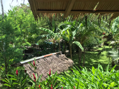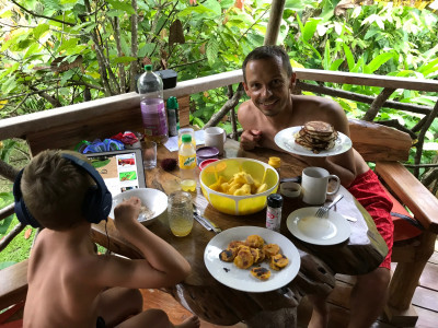 Dort bezogen wir unser Deluxe Baumhaus mit Pool inmitten des Dschungels. Die französischen Eigentümer bauten auf ihrem Anwesen fünf liebevoll gebaute Unterkünfte. In der Regenzeit ist die Buchung der Unterkunft preislich sehr erschwinglich. Die vollausgestattete Küche im Freien nutzten wir somit jeden Tag. Denn gerade das Frühstück ist hier ebenfalls, wie in Nordamerika, wenig abwechslungsreich. Die meisten Einheimischen essen auch am Morgen Reis mit Bohnen, Ei und schlabbriges Weißbrot. Wir haben unsere eigene Gourmetpalette zum Frühstück um Einiges erweitert. So isst Meik gern einen Pancake (natürlich aus Vollkornteig – Doppelschwör), während ich ganz versessen auf gebratene Kochbanane geworden bin. Diese schmeckt sowohl mit Ahornsirup als auch mit Salz. Dazu ein leckeres Porridge mit frischen günstigen Früchten (Ananas, Papaya und Drachenfrucht). Highlight bleibt natürlich, wenn wir ein normales Baguette oder Brötchen ergattern, welches nicht aus Luft besteht und trocken ist (ihr wisst schon was ich meine). Denn ein Vollkornbrötchen oder dergleichen sucht man hier leider vergebens.