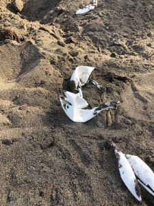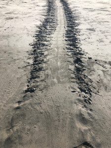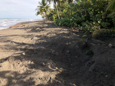 Den Rückweg bestritten wir am Strand entlang. Tortuguero ist die Heimat etlicher Meeresschildkröten und das wichtigste Nistgebiet der bedrohten Grünen Meeresschildkröte in der gesamten Karibik. Juni bis August sind dabei Nistzeiten für die häufig vertretene Grüne Meeresschildkröte. Um jedoch mit etwas Glück das Schlüpfen zu beobachten, muss eine Extratour bei Dunkelheit gebucht werden, da der Strand ab 18 Uhr nicht mehr ohne Guide betreten werden darf. Darauf verzichteten wir und staunten bei Sonnenlicht über die riesigen Abdrücke, große Löcher (gegraben von den Schildis) und aufgebrochenen Eierschalen im Sand.
