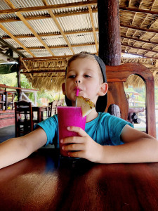 Am nächsten Tag mieteten wir uns zwei quietschende Möhren – ich meinte Fahrräder – für 10 Dollar. Aufsteigen, Mika auf die Stange und hoffen das alles hält. Ziel war der kleine Strandmarkt in Santa Cruz auf dem Einheimische ihre Lebensmittel, Kleidung und Schnickschnack anbieten. Meik‘s Telefon benötigte eine erneute Aufladung mit Guthaben. Es stellte sich jedoch heraus, dass seine Movistar-Karte aus Costa Rica hier nicht aufgeladen werden konnte. Also kauften wir für 2,50 Euro eine neue SIM-Karte inklusive Guthaben. In Deutschland unvorstellbar einfach ohne Vertrag und Unterschrift eine neue Telefonnummer zu erhalten. Danach trieb es uns noch etwas weiter die Straße entlang durch kleine Dörfer bis wir am Strand halt machten. Das Wasser ist hier unerträglich warm und somit alles andere als eine Abkühlung. Auf dem Rückweg stoppten wir an unserem Lieblingscafe namens Campestre und genossen einen kalten leckeren Smoothie und zwei Stückchen selbstgemachte Schokolade aus reinem Kakao (Hinweis von Meik: die Schokolade wurde ausschließlich von weiblichen Teilnehmern dieser Familie gegessen). Zur Feier des Tages ergatterten wir in einem anderen kleinen Lädchen Gehacktes zum Abendbrot. Danach kosteten wir zum letzten Mal den herrlichen Blick zum Vulkan aus und beobachteten die Fledermäuse beim Tanz in der Luft während der einbrechenden Dunkelheit.
