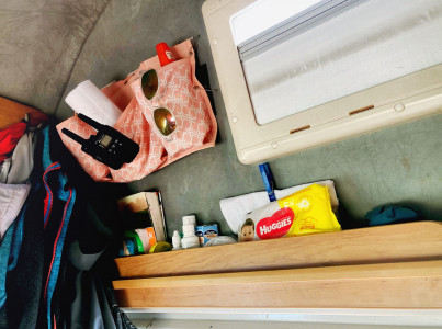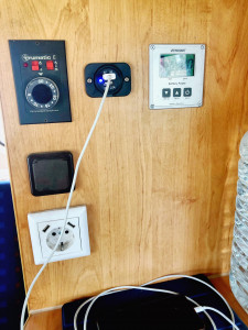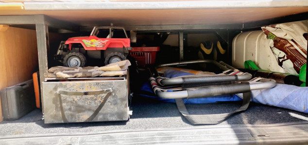 Trotz seiner eher kompakten Abmessungen (von der Höhe mal abgesehen), ist das Auto mit sehr viel schlauen Ablageflächen ausgestattet. In der Technikecke befinden sich die Steckdosen, USB-Steckplätze, die Bedienung für die Standheizung und die Stromverbrauchsanzeige. Unter der Spüle finden die beiden Gasflaschen sowie Wasser und Abwasser Platz.