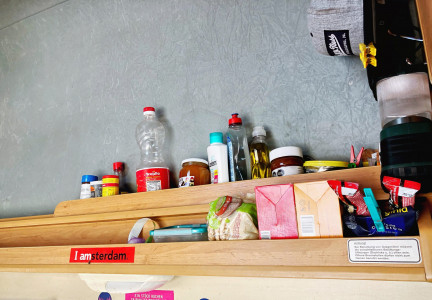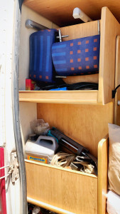 Mit allem ausgestattet was man unterwegs so benötigt und zudem gut verpackt und verstaut. Den Kühlschrank betreiben wir unterwegs v.a. mit Strom aus der Bordbatterie. Die Sonne lädt diese dann wieder auf. Sollte die Sonne mal eine Pause machen, benutzen wir einfach Gas zum Kühlen. Rechts unten lässt sich das gesamte Geschirr verstauen. Über dem Kühlschrank ist das Besteck. Wie zu Hause. 🙂