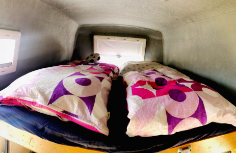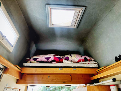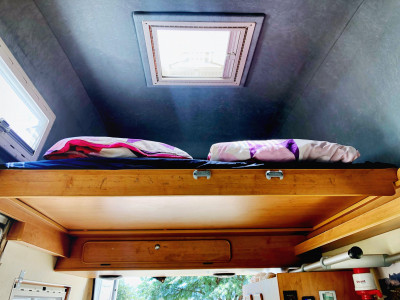 Hoch oben im Dach der Giraffe und meistens zusammengeschoben befindet sich das Schlafzimmer für die Großen. Von der Breite her auch für 2,5 Leute geeignet, hängen die Füße nach vorne schonmal gerne heraus. Ansonsten ist das Bett in wenigen Sekunden ausgezogen und aufgebaut. Viel praktischer und effizienter geht es eigentlich nicht.